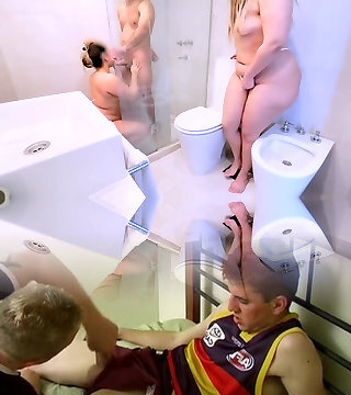 Humid amateur babes sharing stiff cock in shower