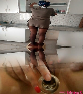 Hijab Turkish dame wipes kitchen cabinets