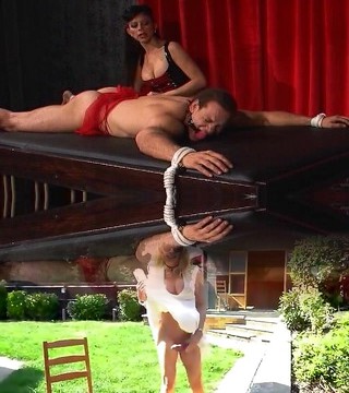 Mature female Cherry Torn tortures her male slave with fuck machine