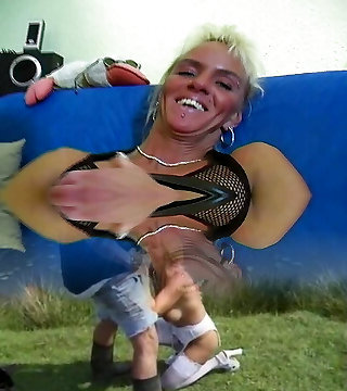 Tattooed granny with pierced melons enjoying a hardcore FFM threesome