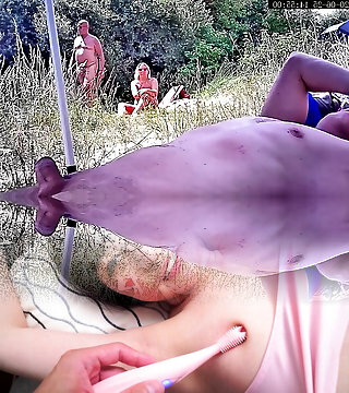 Getting firm in front of an older duo by the nude lake