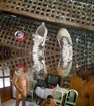 Fake Hostel - after edging with two curvy femmes a guys throbbing ball sack shoot a waterfall of cum